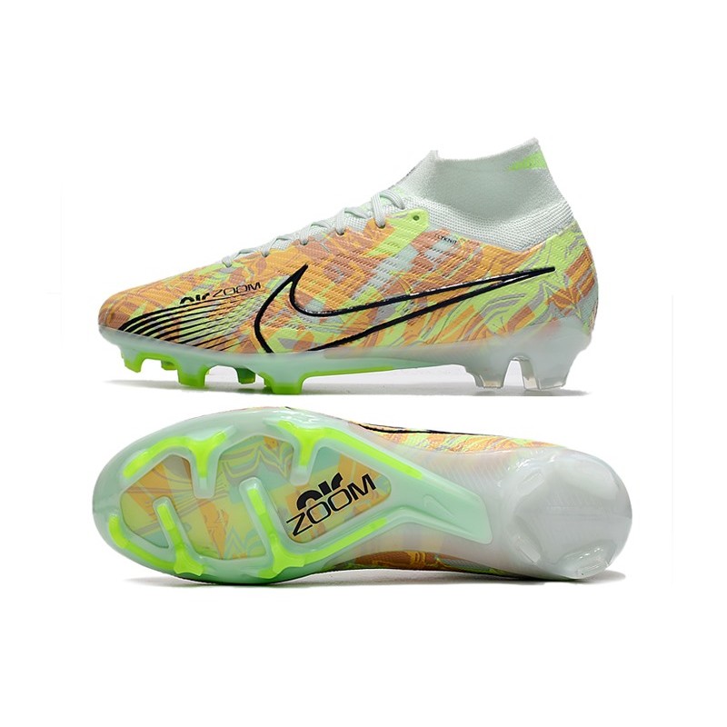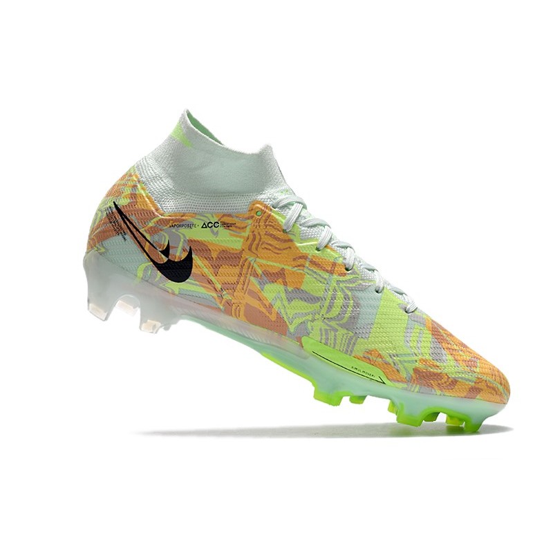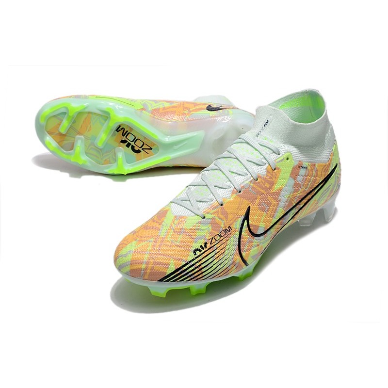 Dess nike mercurial superfly 9 övre del är gjord av syntetiskt läder med strukturmönster som hjälper till att få bättre bollhantering. Den har en Flyknit-passform som skyddar fotleden genom att helt täcka den med ett vadderat och elastiskt ribbad tyg.